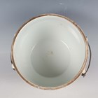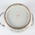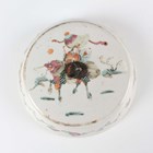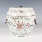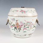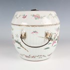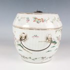 A Chinese famille rose porcelain food jar and cover, early 20th century, of vertically ribbed drum form, painted and gilt with figural scenes and flowers, indistinct red printed seal mark to base, height 16cm (minor rim chips).