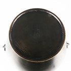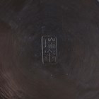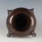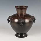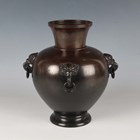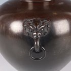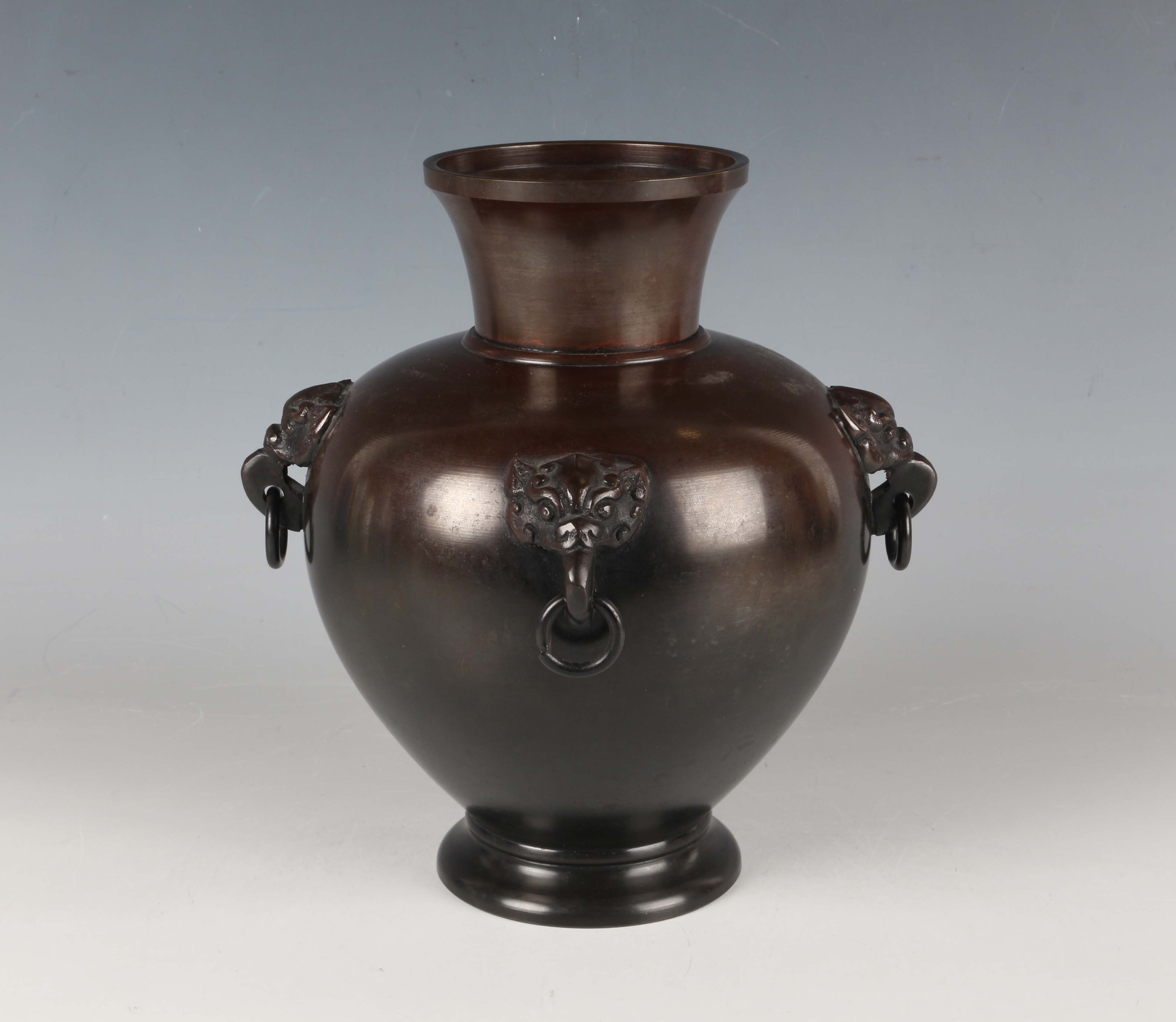 A Japanese brown patinated bronze vase, Meiji/Taisho period, the globular body applied with four mask and tongue with loose ring handles beneath a short flared neck, incised seal mark to base, height 21.5cm.
