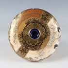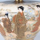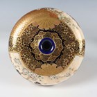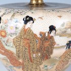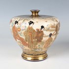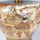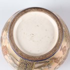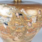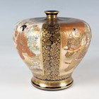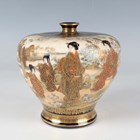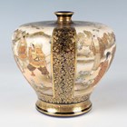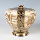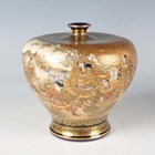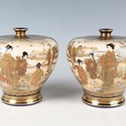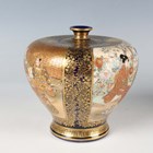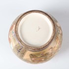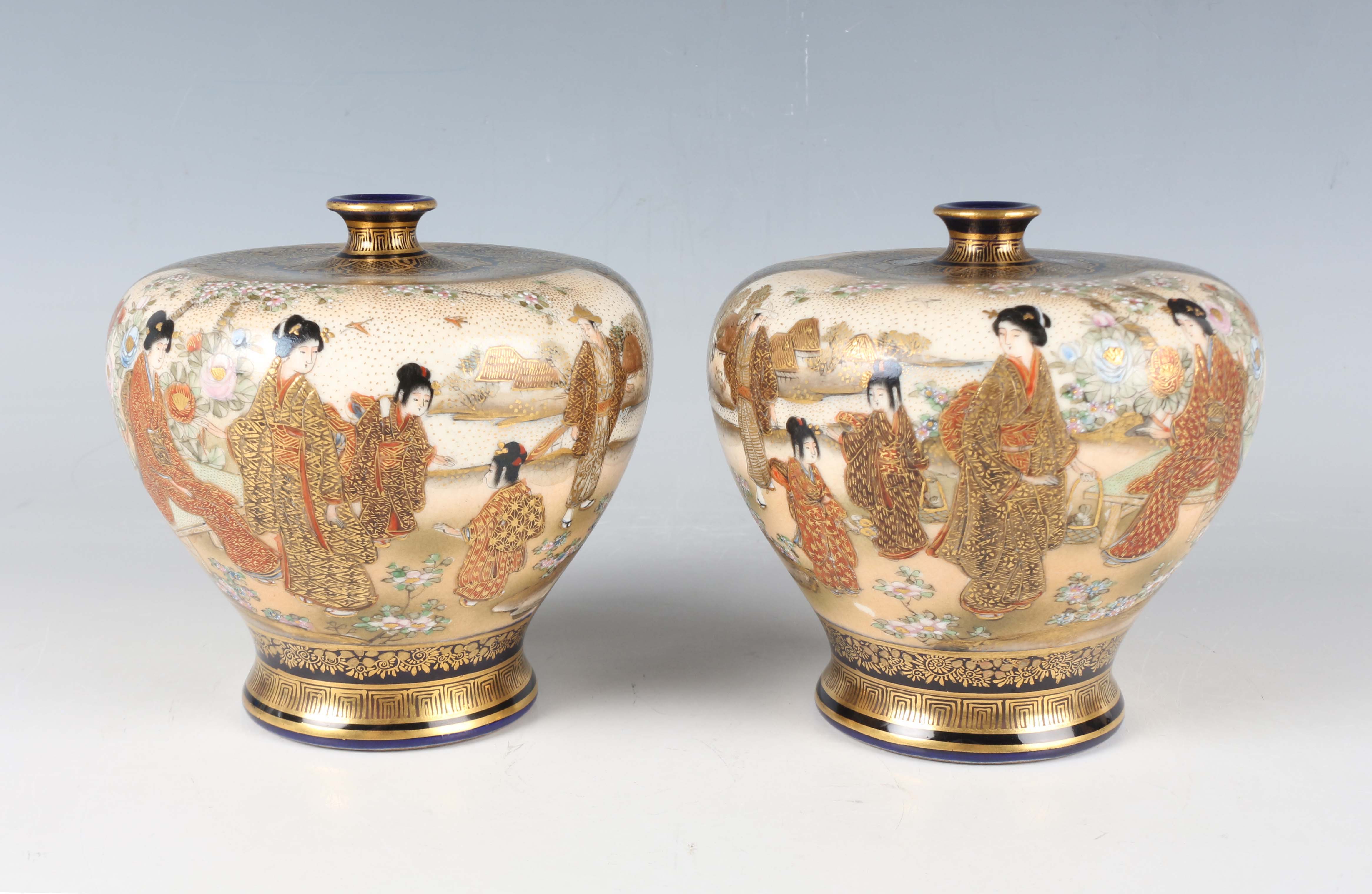 A pair of Japanese Satsuma earthenware vases by Kinkozan, Meiji period, each of squat baluster form, painted and gilt with opposing panels of samurai and bijin, reserved against a dark blue ground filled with gilt foliage, rubbed gilt signature to base of one, height 10.3cm.