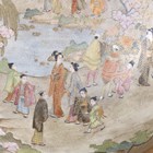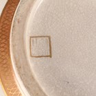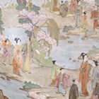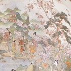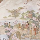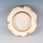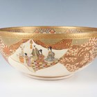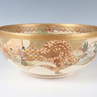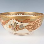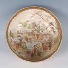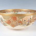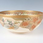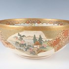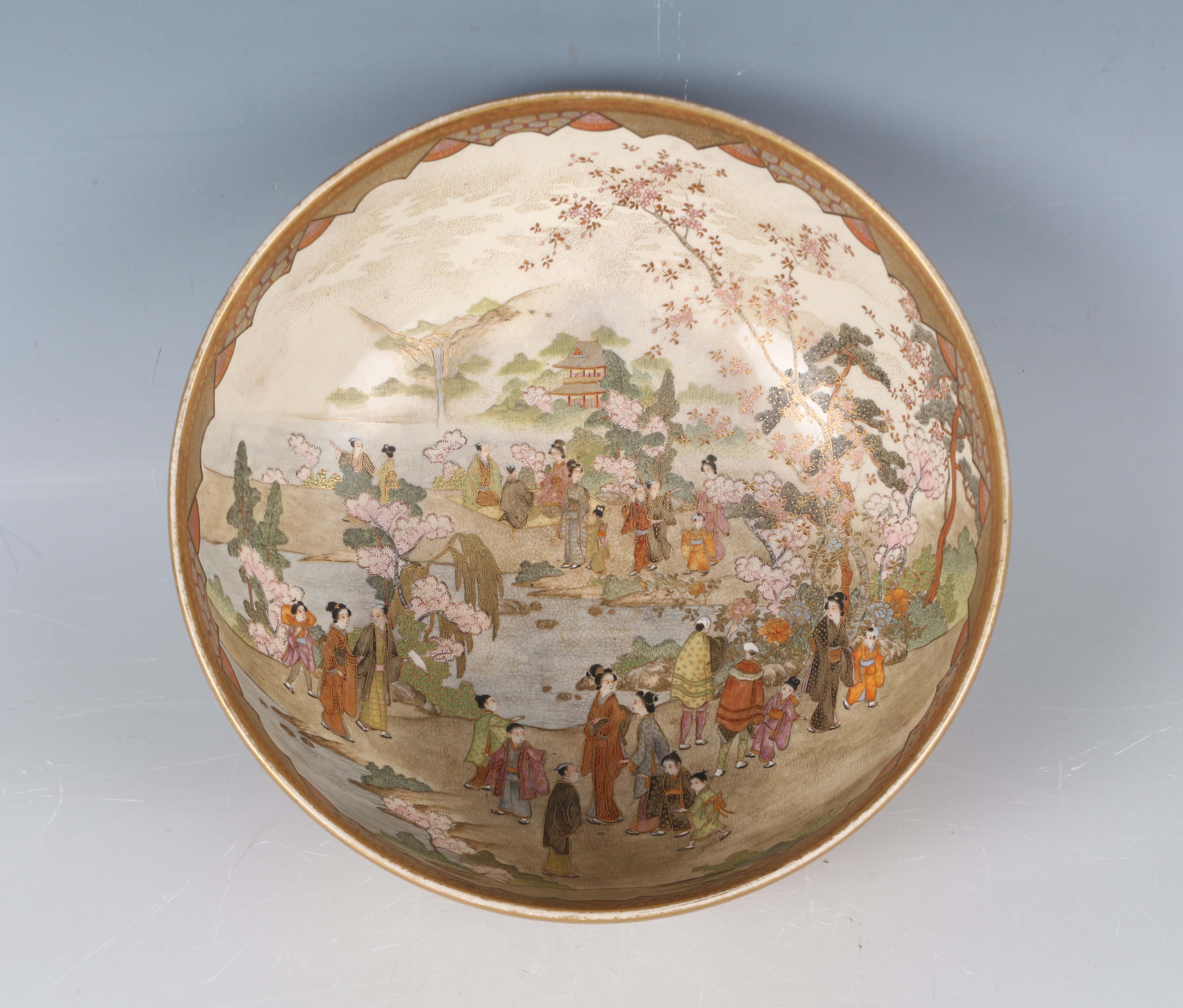 A Japanese Satsuma earthenware circular bowl by Kinkozan, Meiji period, the interior finely painted and gilt with figures walking around blossom trees, with pavilion and waterfall beyond, beneath a rim of simulated brocade panels, the exterior with panels of figures, landscapes and simulated brocade, impressed signature seal to base, height 8cm, diameter 18.7cm.