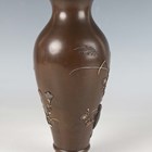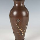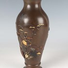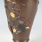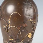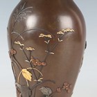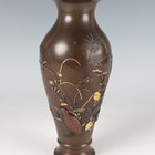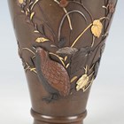 A Japanese mixed metal inlaid brown patinated bronze vase, Meiji period, the baluster body finely worked with a quail amidst grasses, flowers and foliage, unsigned, height 18cm. Provenance: formerly from an Austrian private collection.