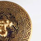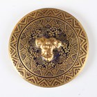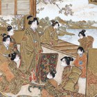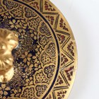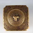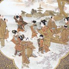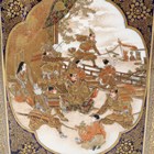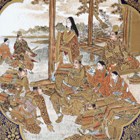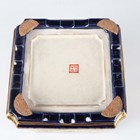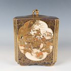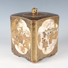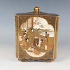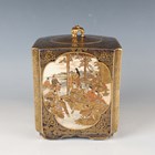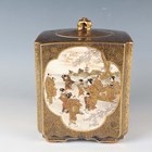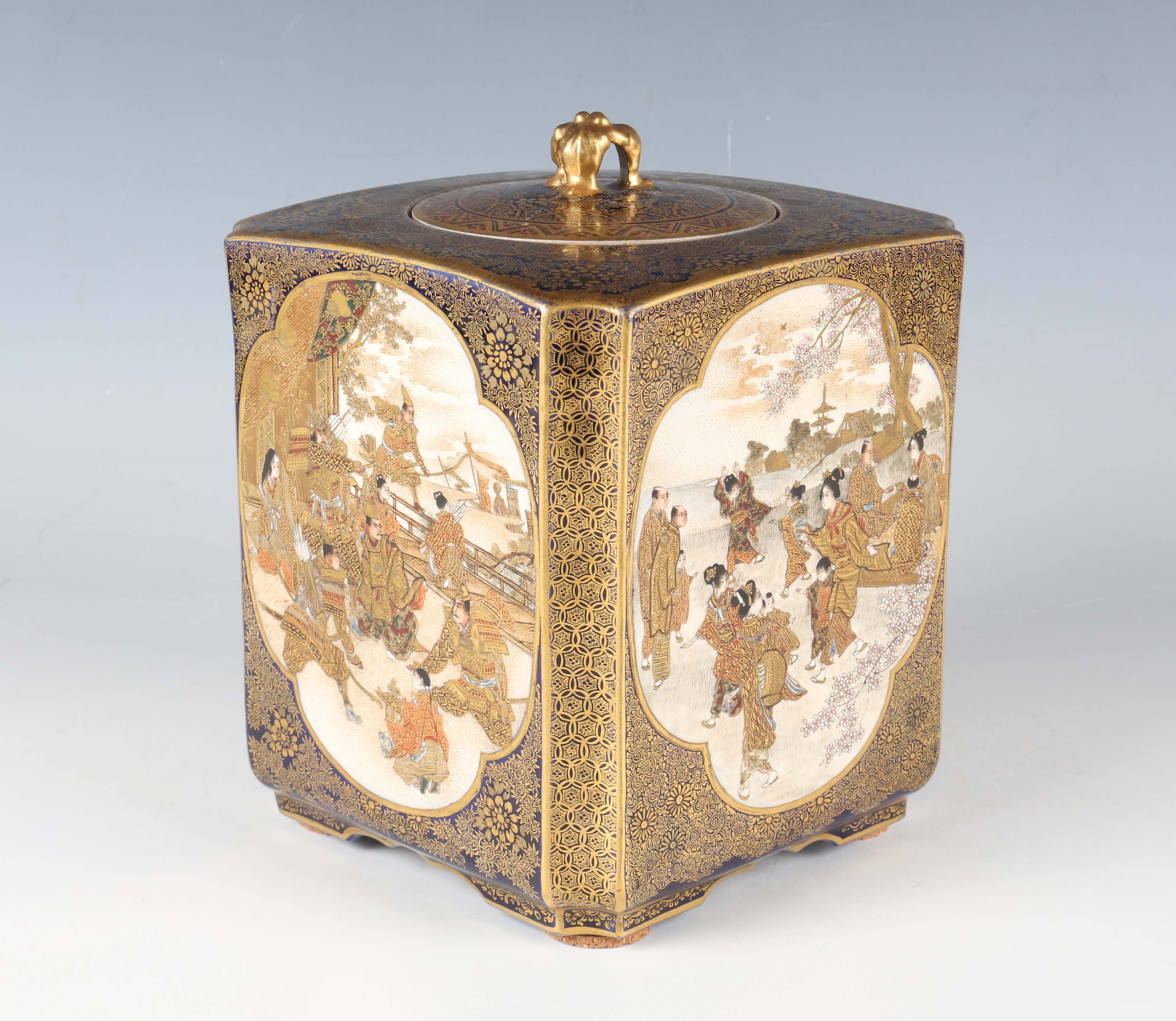 A Japanese Satsuma earthenware jar and cover by Kinkozan, Meiji period, of square form with fluted corners, each side finely painted and gilt with quatrelobe shaped figural panels of samurai, maidens and children, reserved against a dark blue ground, filled with gilt flowers, scrolls and simulated brocade, the similarly decorated cover with foliate finial, iron red enamelled signature seal and impressed seal to base, height 17cm (cover restored).