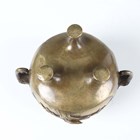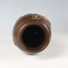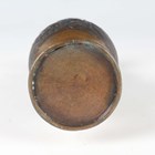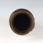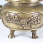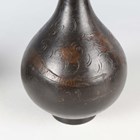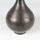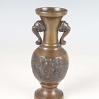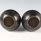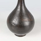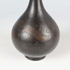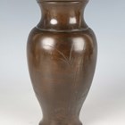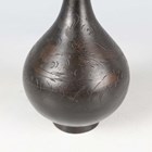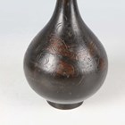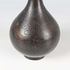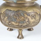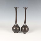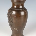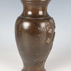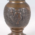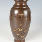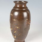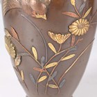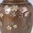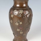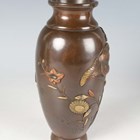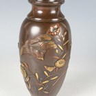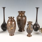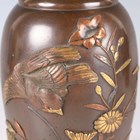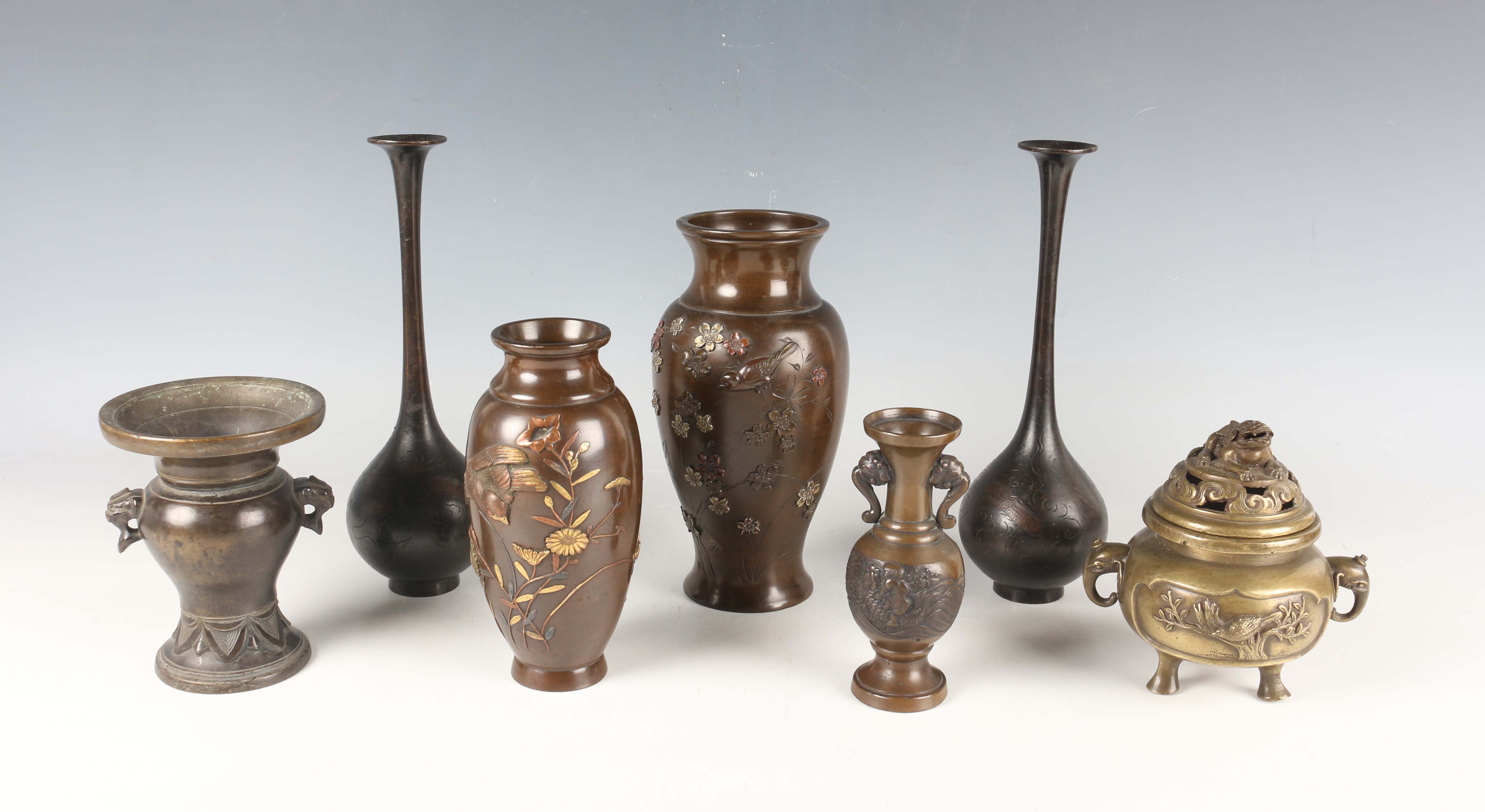 Two Japanese mixed metal inlaid brown patinated bronze vases, Meiji period, each decorated with birds and flowers, heights 18cm and 15cm, together with a small group of bronze vessels, comprising a koro and cover, height 11.5cm, and four vases, heights 11.5cm, 11.9cm and 21.5cm.