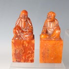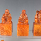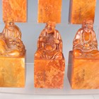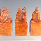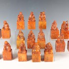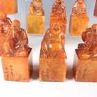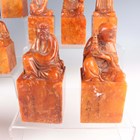 A group of eighteen Chinese carved soapstone lohan figural seals, modern, each modelled seated on a cube base, heights 11.5cm to 12cm.