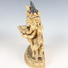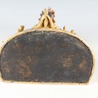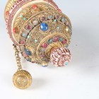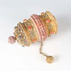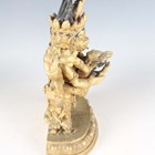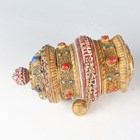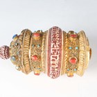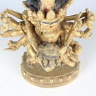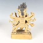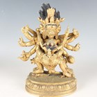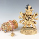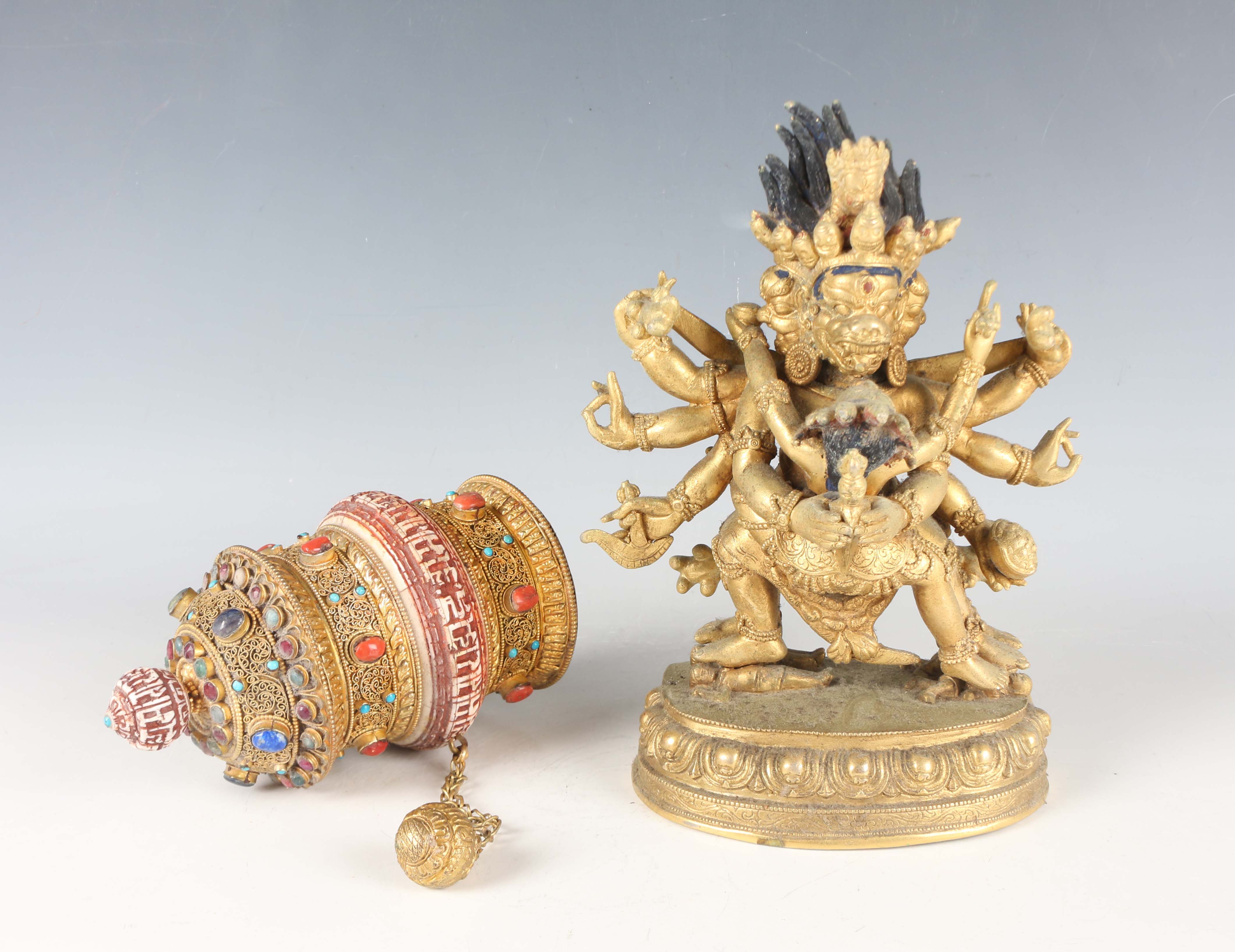 A Sino-Tibetan gilt metal figure group of Mahakala and his consort in yab-yum, 20th century, the eight-armed deity and female consort wearing elaborate headdress, on a lotus moulded oval base, height 20cm, together with a Tibetan gilt metal prayer wheel, 20th century, decorated with bands of filigree scrolls and set with varicoloured hardstones and gems, length 15.5cm (lacking handle).
