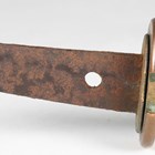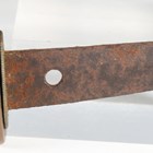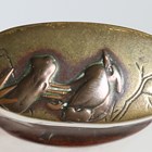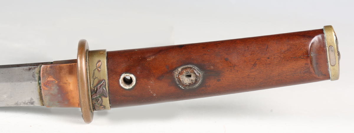 A late 19th century Japanese wakizashi with curved single-edged blade, blade length 38cm, the tang unsigned, oval copper tsuba with textured surface decoration and two seashells, oval copper habaki and wood grip, mounted with brass fuchi and koshira and decorated in copper inlay with birds and foliate motifs, with lacquered scabbard with brass kojiri tip (lacking utility knife).