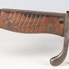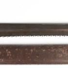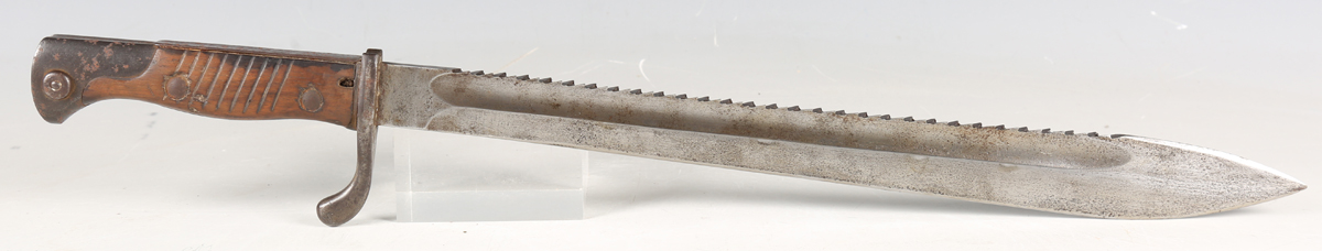A First World War period German 1898/05 pattern bayonet with typical swollen fullered blade with serrated saw-back face, blade length 36.5cm, curved steel quillon and wood plate grips, with steel scabbard.