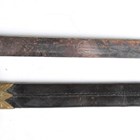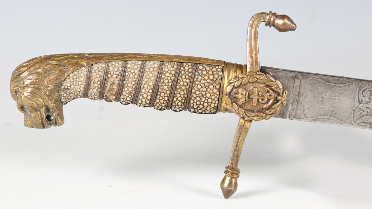 A Victorian naval officer's dirk by E.A. Seagrove, The Hard, Portsea, with straight single-edged blade, blade length 43.5cm, etched with 'VR' cypher, fouled anchor and foliate decoration, the ricasso personalized to 'L. Bayly R.N.', cast brass crossguard, wire bound fishskin grip and lion head pommel, with brass mounted stitched leather scabbard (overall environmental damage and live rust, guard misshapen).