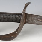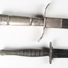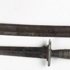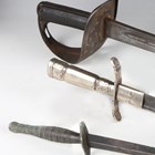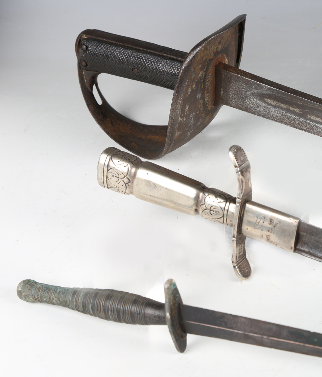 A small group of edged weapons, comprising an 1885 pattern cavalry trooper's sword with curved single-edged blade, blade length 85.5cm, and steel bowl guard with pierced Maltese cross design, a converted smallsword with nickel grip and a 20th century copy of a fighting knife.