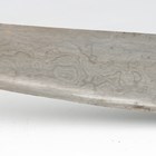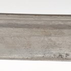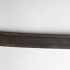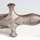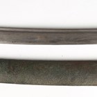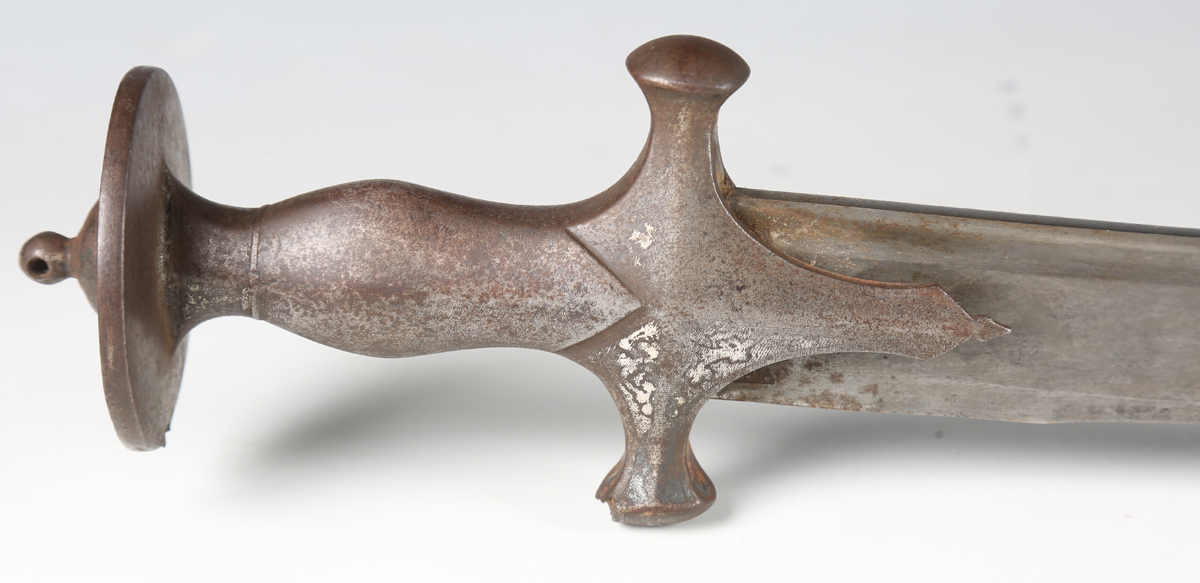 A fine 19th century Indian tulwar with slightly curved single-edged fullered blade, blade length 74cm, stamped with back-to-back crescents and a series of dots, and typically formed hilt with damascened floral decoration and disc-form pommel (lacking knuckle guard), with green stained and white metal stitched hide scabbard with white metal chape.