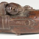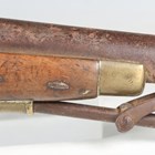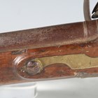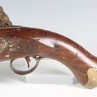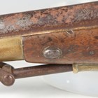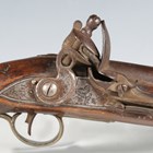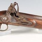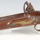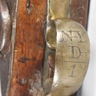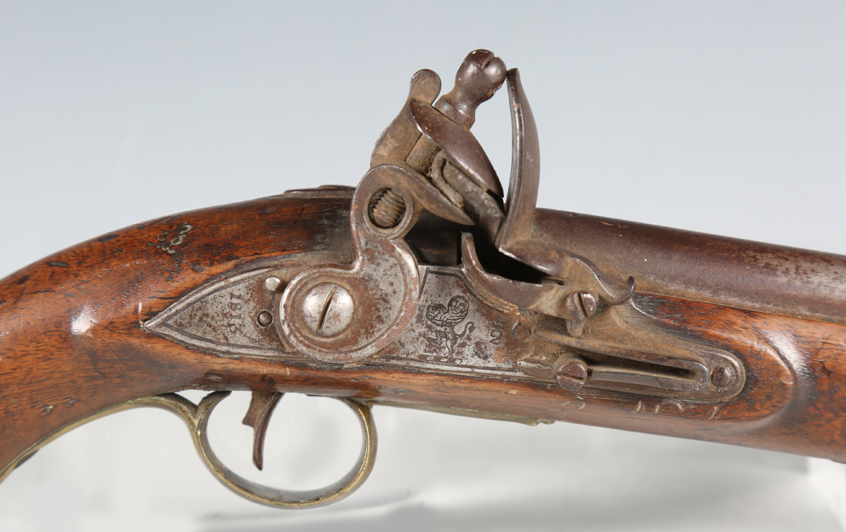 A George III period new land pattern flintlock service pistol with round steel barrel, barrel length 23cm, line border engraved lock, dated 1813 and marked with East India Company lion, full-stocked with brass furniture and pull-out steel captive ramrod, the brass trigger guard engraved 'NYD 1', various stamps and inventory numbers to the wood (action works at half and full cock).