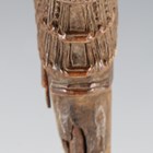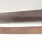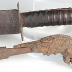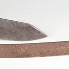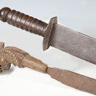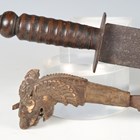 An 18th/19th century Sinhalese kastane sword with curved blade, blade length 42cm, and carved wood makara lion hilt (overall relic-found condition), together with another 18th/19th century smallsword, possibly South-east Asian, with straight clip-point blade, blade length 35.5cm, cut steel guard of octagonal form and ring turned wood grip.