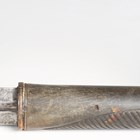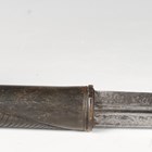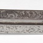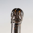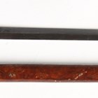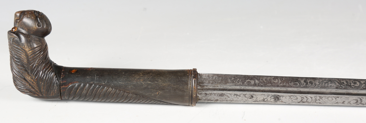 A 19th century and later swordstick with straight double-edged fullered blade, blade length 81.5cm, finely etched with foliate decoration and military trophies and detailed 'Labruna Napoli 1845', and two-part carved horn lion-head handle, with wood scabbard (blade and handle probably associated).