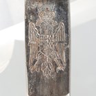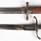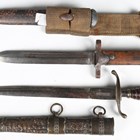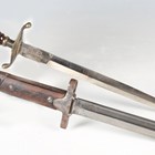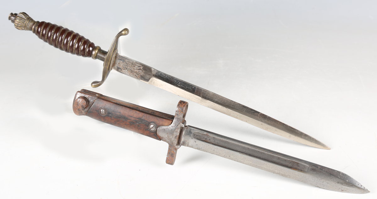 A Second World War period Italian M38 fixed knife bayonet with straight single-edged fullered blade, blade length 17.5cm, and wood plate grips, numbered 'M 10758', with steel scabbard and associated canvas frog, together with a 20th century copy of a Yugoslavian army officer's dress dagger with straight double-edged blade, blade length 23.5cm, with scabbard.