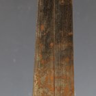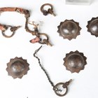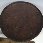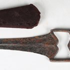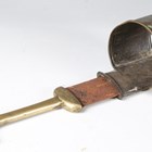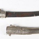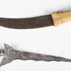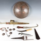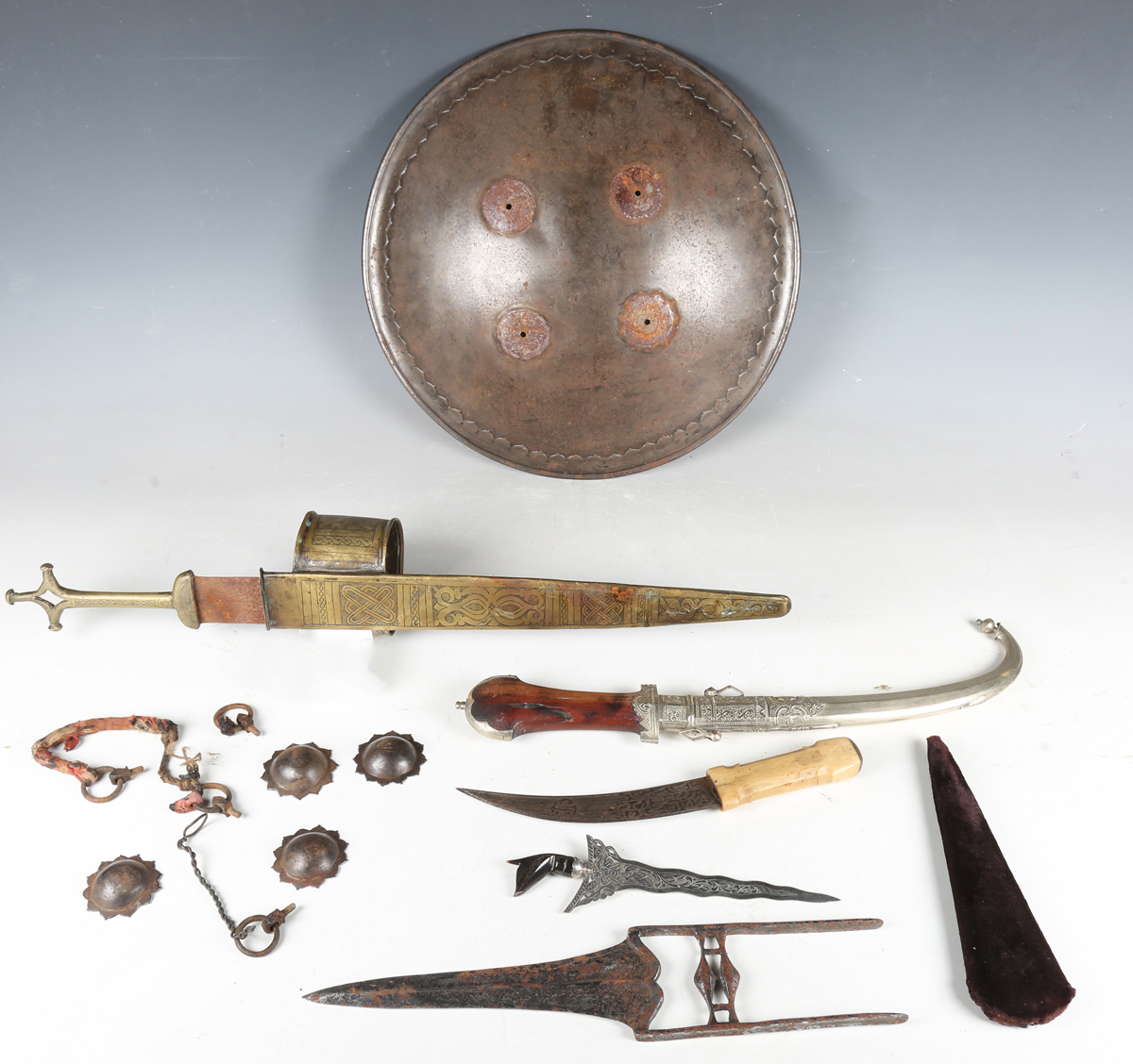 A small group of edged and other weapons, including a Sudanese leg or arm shortsword with straight double-edged blade, blade length 36cm, and shaped brass grip, with decorated brass scabbard with bracelet style ring fitting (heavy active rust to blade), and a small dagger with curved double-edged blade, blade length 17cm, etched with Islamic style script, together with an Indian steel dhal shield, diameter 36cm (faults throughout).