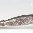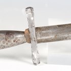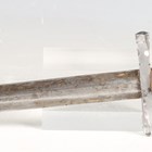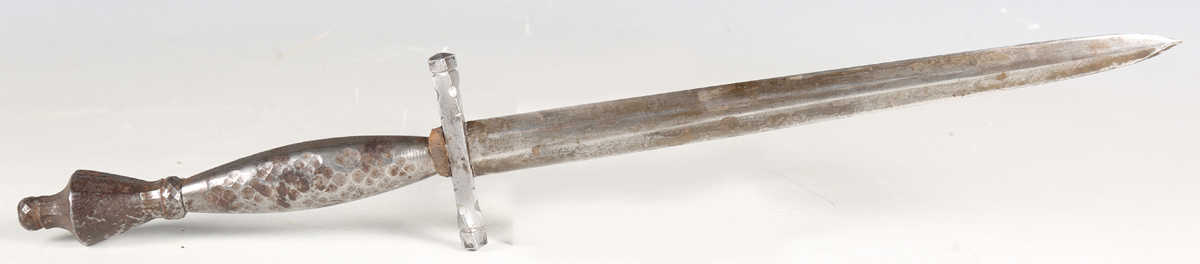 A late 19th century stiletto dagger with straight double-edged blade, blade length 23.5cm, cut steel crossguard and facet cut steel grip and pommel, with a leather scabbard, probably associated.