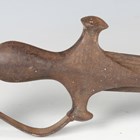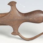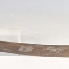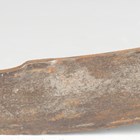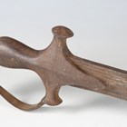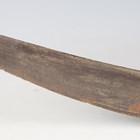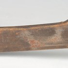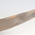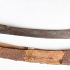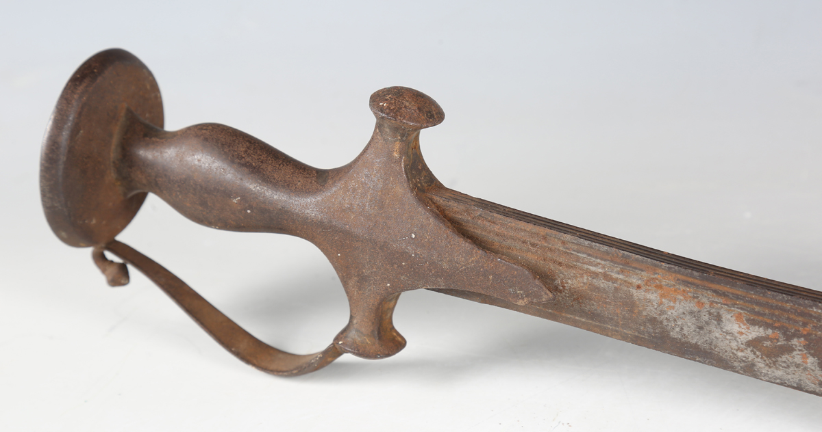 A scarce 19th century Indian tulwar-hilted kilij-type all-steel shortsword with curved single-edged blade with false-edge tip and grooved and fullered spine, blade length 57cm, typical steel grip, knuckle guard and disc shaped pommel, with the remnants of a wood scabbard (fatigued throughout, losses, some active rust in places).