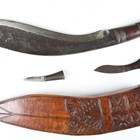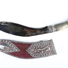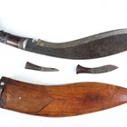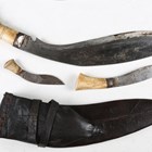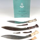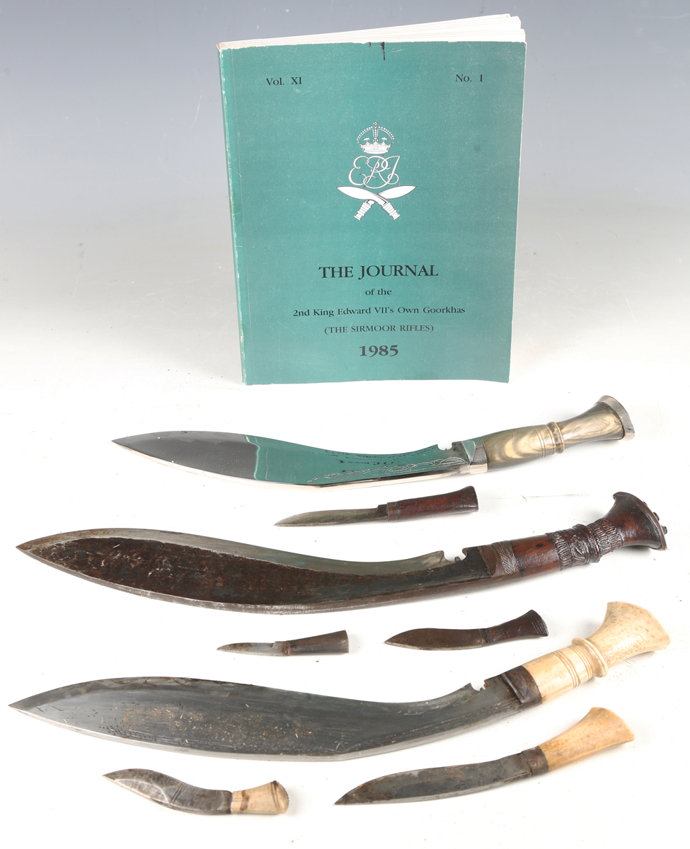 A mid-20th century South-east Asian presentation kukri knife with typical curved blade, blade length 23cm, and shaped horn handle, with finely cast and chased white metal mounted scabbard, decorated in high relief with a spirited dragon and highlighted behind with red foil and bands of foliate decoration forming a lozenge shaped chape, together with two further kukri knives and a 1985 edition of 'The Journal of the 2nd King Edward VII's Own Goorkhas (The Sirmoor Rifles)'.