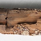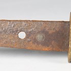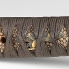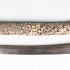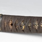 A late 19th century Japanese wakizashi with curved single-edged blade, blade length 46.5cm, the tang unsigned, and fabric tape bound fishskin grip with hidden gilt menuki, with composite formed shagreen/fishskin covered wood scabbard (lacking tsuba, blade with some active rust, overall environmental damage and losses).