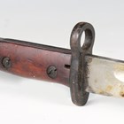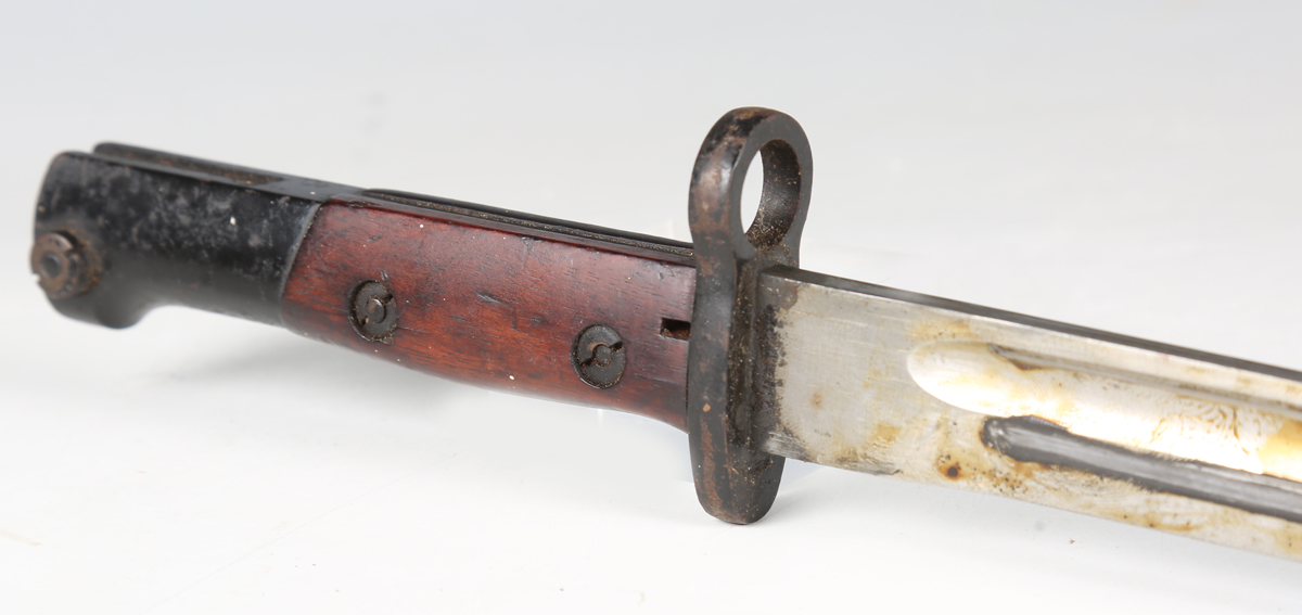 A Belgian M1924 Mauser bayonet with straight single-edged deep-fullered blade, blade length 38cm, steel crossguard and wood plate grips, with steel scabbard.