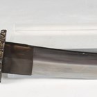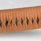 A 20th century Japanese tanto with slightly curved single-edged blade with fine wave-like hamon, blade length 18.5cm, the tang signed, shaped oval cast bronze tsuba and fabric tape bound fishskin grip, with pink/red stained scabbard.