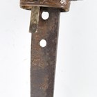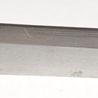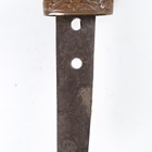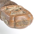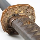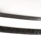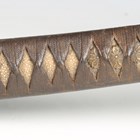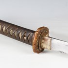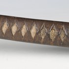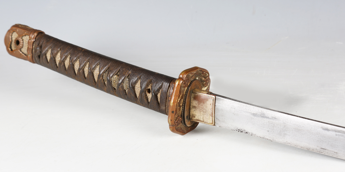A Second World War period Japanese katana with curved single-edged blade, blade length 62cm, the unsigned tang with double peg hole piercings, cast bronze tsuba, tape bound fishskin grip with hidden cast bronze flowerhead menuki fitting, fuchi and kabuto-gane pommel, the fuchi with spring loaded scabbard release, with later black painted scabbard with single ring suspension (scabbard distressed and bruised overall).