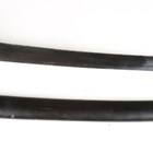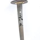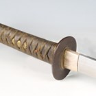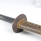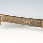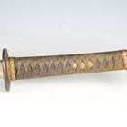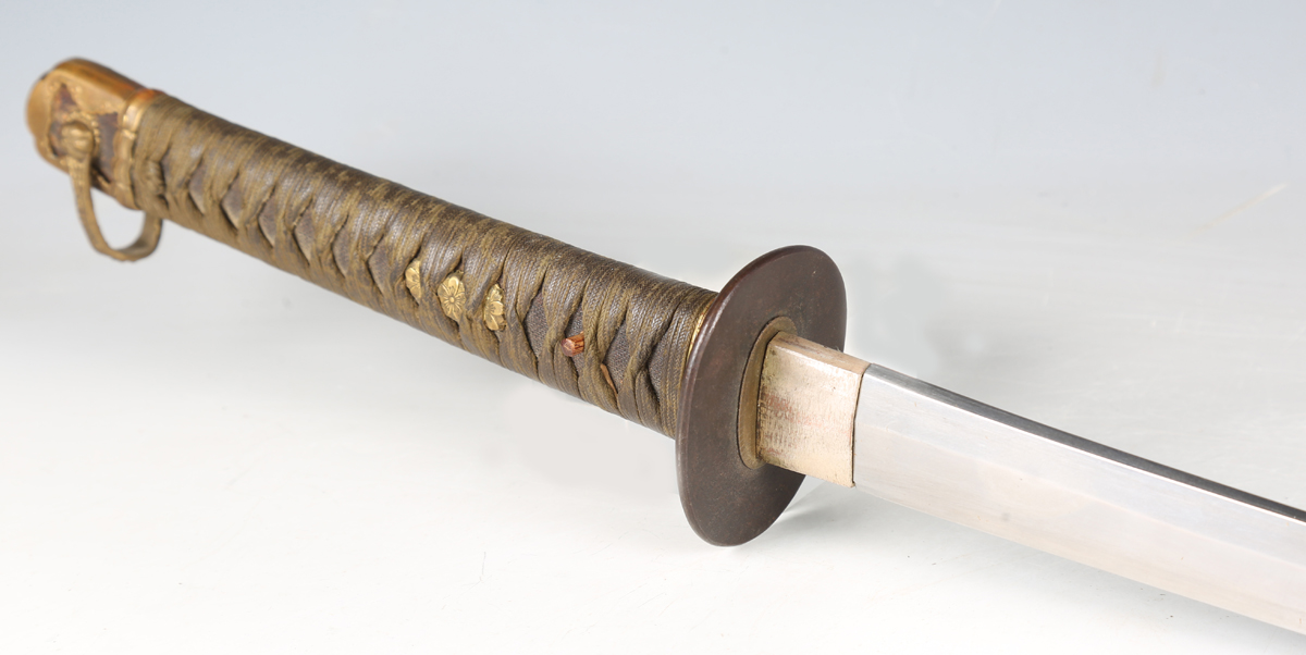A fine Second World War period Japanese katana with curved single-edged blade, blade length 61cm, the tang with painted signature, oval steel tsuba, fabric tape bound fishskin grip with partially hidden flowerhead menuki fittings, fuchi and kabuto-gane pommel, with black lacquered scabbard with single ring suspension.