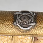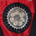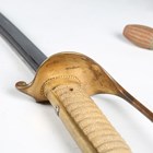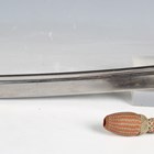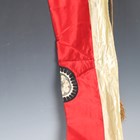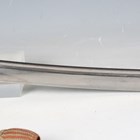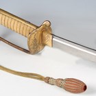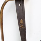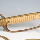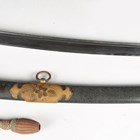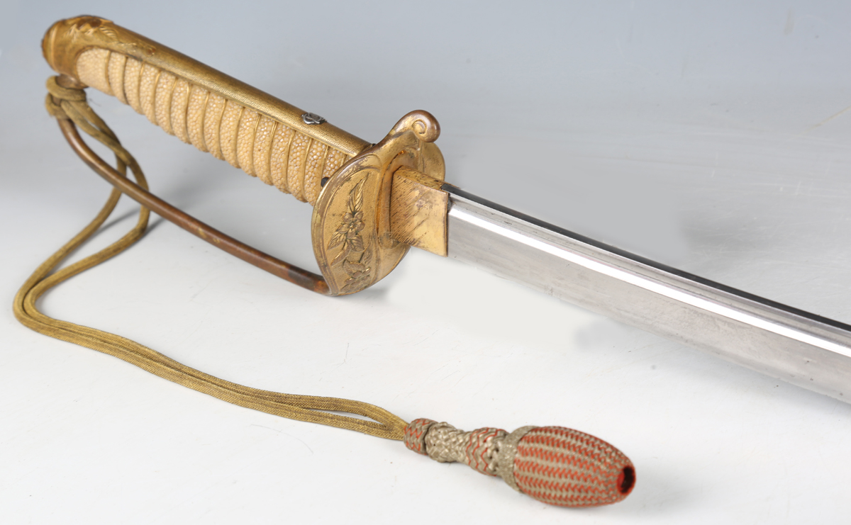 A fine and rare Second World War period Japanese naval kyu-gunto sword with curved single-edged fullered blade, blade length 62cm, the tang signed finely in gilt metal inlay, gilt cast brass part-folding elongated hilt with wire bound fishskin grip, the spine of the grip with mon/family crest insignia, and bullion braided knot, with stained fishskin covered scabbard with fine foliate decorated gilt metal mounts and twin ring suspension, and embroidered red silk slip case bag (some shrinkage and damage to scabbard).