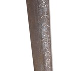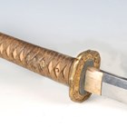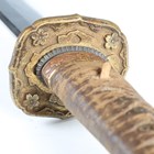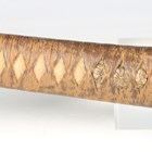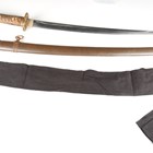 A Second World War period Japanese katana with curved single-edged blade, blade length 67cm, the signed tang with single peg hole piercing, gilt cast bronze tsuba, fabric tape bound fishskin grip with partially hidden gilt flowerhead menuki, fuchi and kabuto-gane pommel, the fuchi with spring loaded scabbard release, with brown painted metal and gilt metal applied scabbard with single ring suspension, and a later black cotton slip case bag.