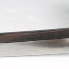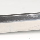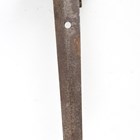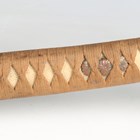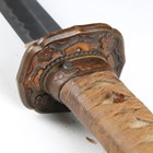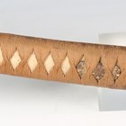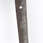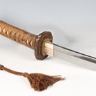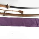 A fine Second World War period Japanese katana with curved single-edged blade, blade length 62cm, with fine even hamon, the signed tang with single peg hole piercing, decorated cast bronze tsuba, fabric tape bound fishskin grip with partially hidden flowerhead menuki fittings, fuchi and kabuto-gane pommel with brown tassel/knot, the fuchi with spring loaded scabbard release, with brown painted metal scabbard with single ring suspension, and a later purple cotton slip case bag.