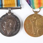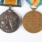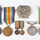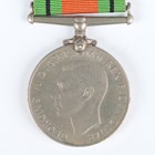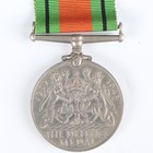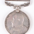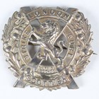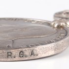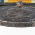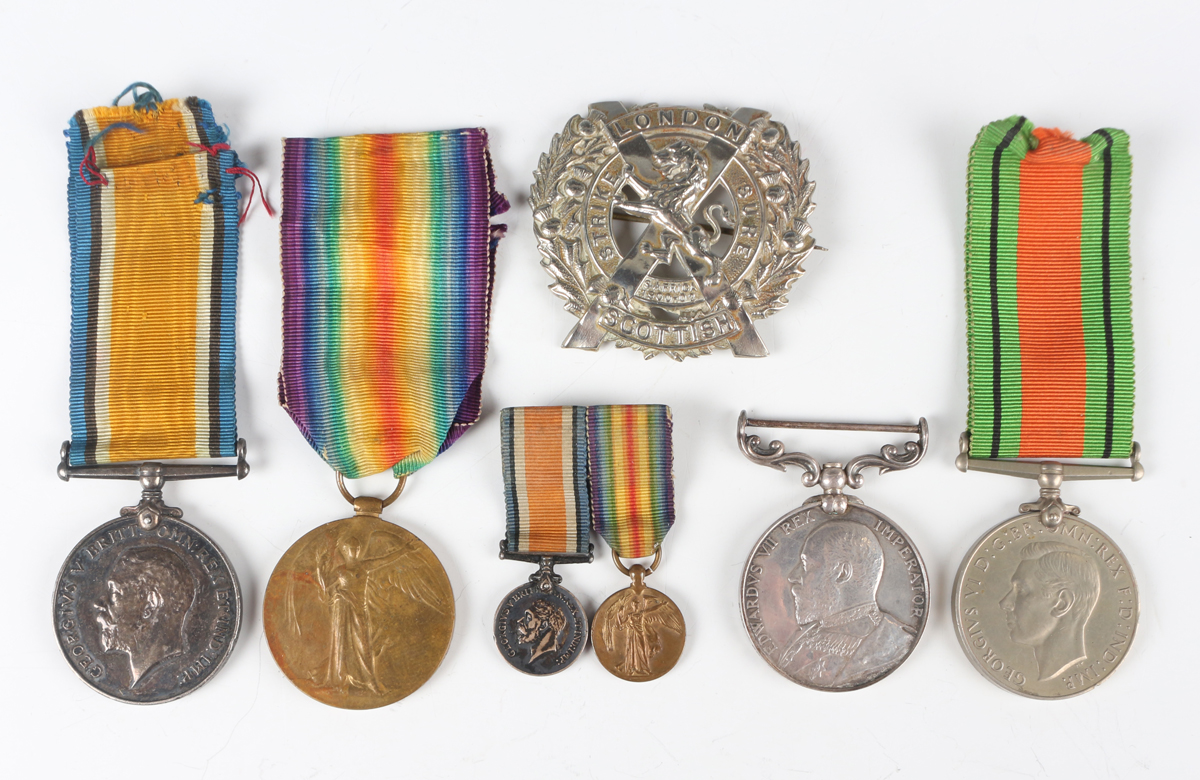 A 1914-18 British War Medal and a 1914-19 Victory Medal to ‘59730 Pte.A.F.E.Denny. R.S.Fus.’, a pair of First World War dress miniature medals, a 1939-45 Defence Medal, an Army Long Service and Good Conduct Medal, Edward VII issue, to ‘5182 Co: Serjt:- Maj: F.G.Lisney. R.G.A.’ (official correction to the surname), and a London Scottish cap badge with brooch pin fittings.