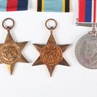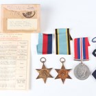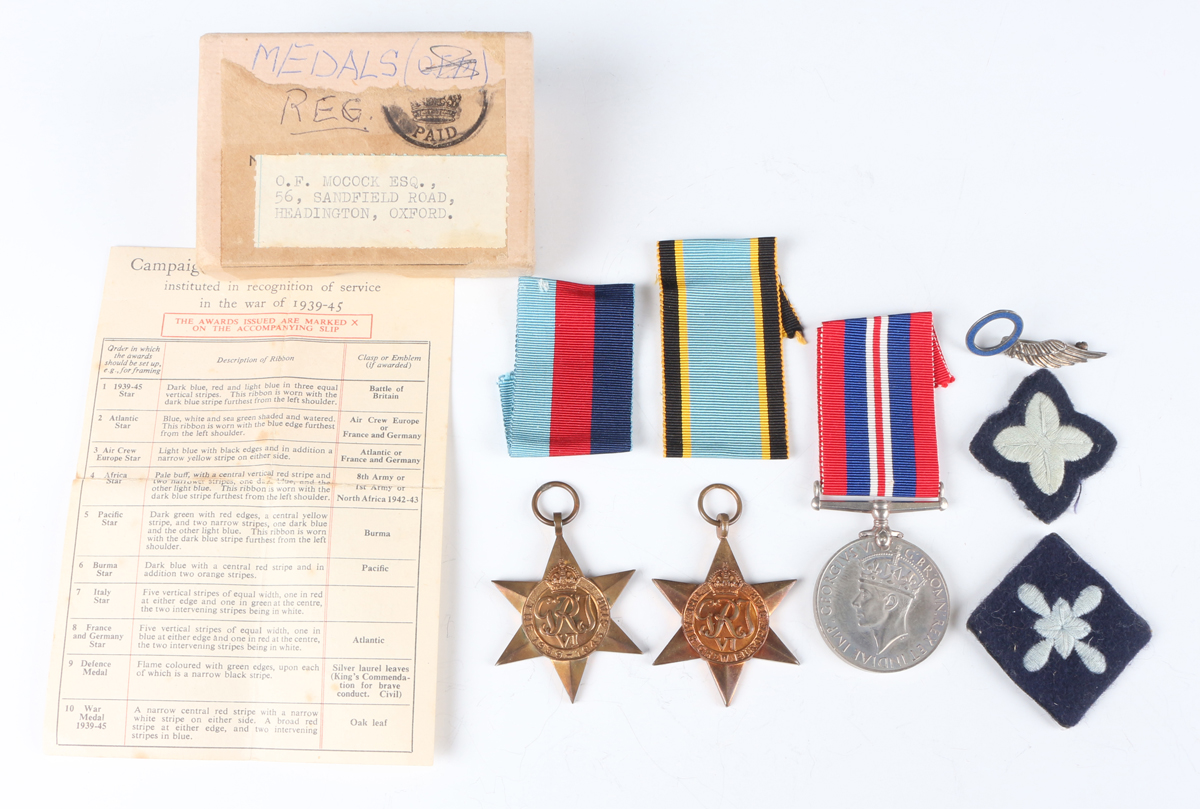 Three Second World War awards relating to Sergeant R.C. Mocock, comprising 1939-45 Star, Air Crew Europe Star and 1939-45 War Medal, with the Air Council forwarding slip relating to the late Sergeant R.C. Mocock, with the Air Ministry box of postage, addressed to 'O.F. Mocock Esq', a sterling silver and blue enamelled Observer’s brooch and two cloth badges. Note: Sergeant R.C. Mocock died 17th December 1942 and is buried or commemorated at the Rheinberg War Cemetery, Germany.