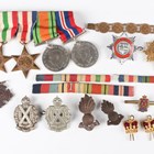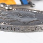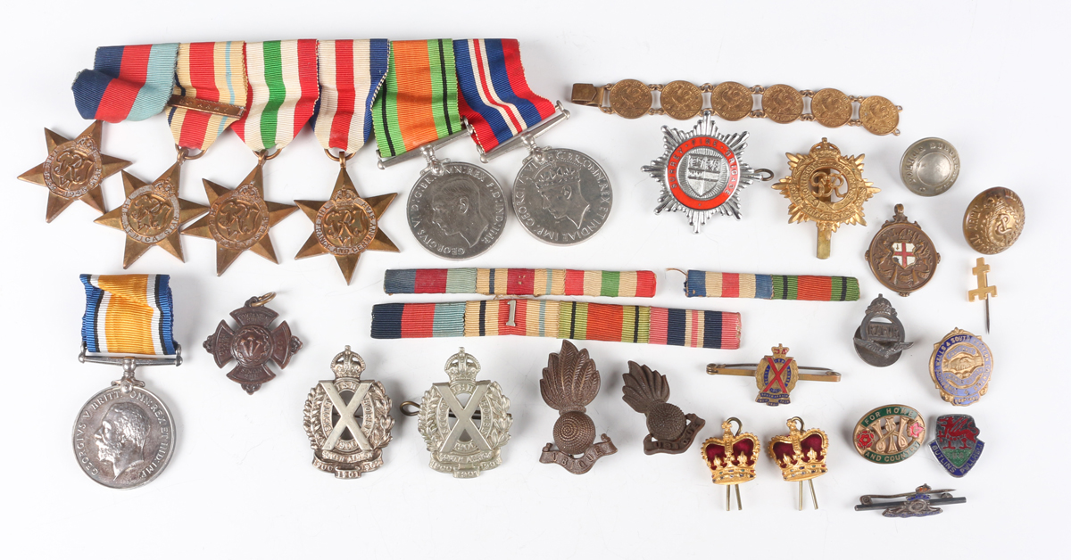 A 1914-18 British War Medal to ‘200838 A.Sjt.L.Hopper. E.Surr.R.’, six Second World War medals, comprising 1939-45 Star, Africa Star with bar '8th Army', Italy Star, France and Germany Star, Defence Medal and War Medal, all unnamed, mounted on a bar, and a group of badges, including Surrey Fire Brigade, two Scottish Horse collar badges and two buttons.