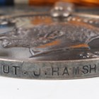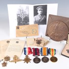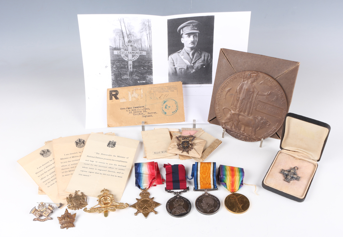 A group of First World War medals relating to John Hamshere, comprising Distinguished Conduct Medal, George V issue, to ‘42040 B.S.Mjr:J.Hamshere. 10/Bty:Can:Art:’, 1914-15 Star to ‘42040 B.S.Mjr J.Hamshere. Can:Fd:Art:’ and 1914-18 British War Medal and 1914-19 Victory Medal to ‘Lieut.J.Hamshere’, a First World War period bronze memorial plaque, detailed ‘John Hamshere’, with forwarding slip, envelope and folding card cover, a Canadian Memorial Cross, George V issue, detailed ‘Lieut.J.Hamshere D.C.M.’, with case of issue, five brooches and badges, a postal envelope and three forwarding slips to accompany the medals, and a copy of two photographs. Note: John Hamshere died of wounds 12th July 1917 and is buried in the Ecoivres Military Cemetery, France.