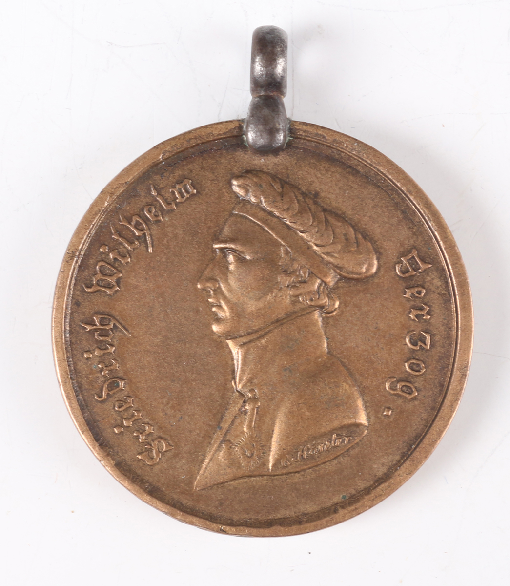 A Brunswick Medal for Waterloo 1815 with impressed naming ‘Heinr. Schulz. Av. Garde.’ (replacement steel clip, lacking loop suspension and ribbon).