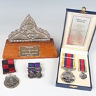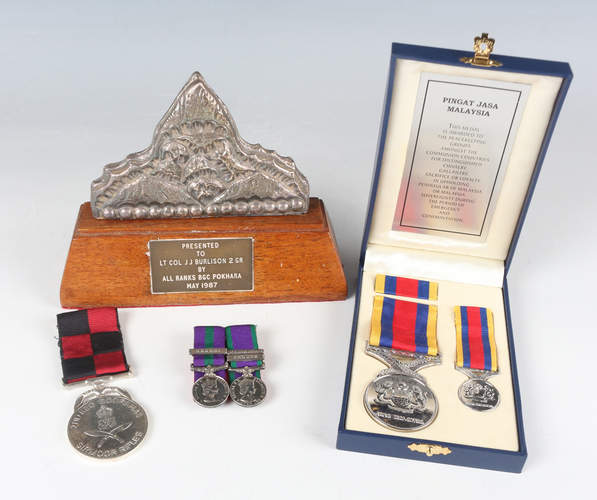 A group of items associated with Lt. Col. J.J. Burlison, 2nd Gurkha Rifles, comprising a presentation silvered ornament, probably Nepalese, the plaque detailed ‘Presented to Lt Col J J Burlison 2 GR by all ranks BGC Pokhara May 1987’, two court mounted dress miniature medals, comprising General Service Medal with bar 'Brunei' and Campaign Service Medal with two bars, 'Borneo' and 'Northern Ireland', a Pingat Jasa Malaysia Medal and dress miniature medal, cased, and a 2nd KEO Goorkhas commemorative medal, detailed ‘1815-2015’, with box.