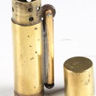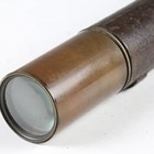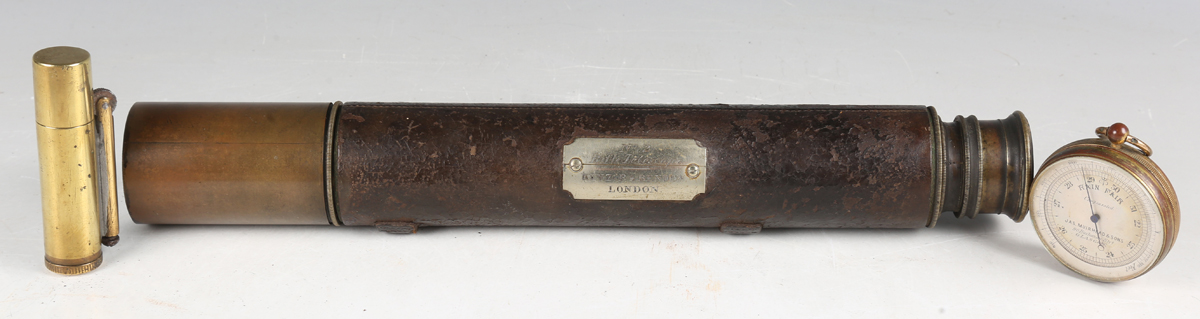 A 19th century No. 2 rifle telescope by Keyzor & Bendon, London, with leather bound body and two-draw adjustable shaft, the body mounted with a white metal plaque and leather suspension loops, extended length 62cm, together with a pocket barometer by Jas. Muirhead & Sons, 90 Buchanan Street, Glasgow, and a trench art lighter, made from a .303 rifle oil bottle.