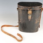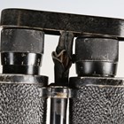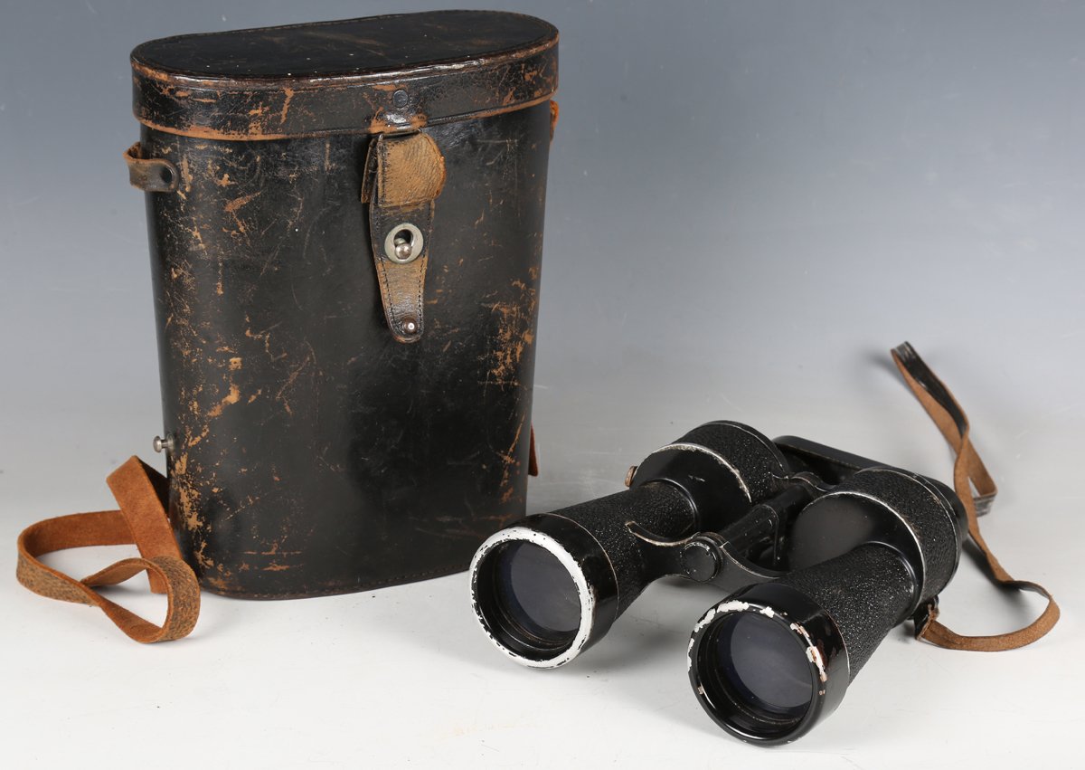 A pair of Second World War period German military issue 7x50 binoculars, marked with maker's code 'beh' for Ernst Leitz Wetzlar and numbered '319792 M 213354 N', with black painted finish, spring mounted lens cap protectors and associated leather strap, with stitched leather fitted case (overall wear and tear and loss to paint finish throughout).