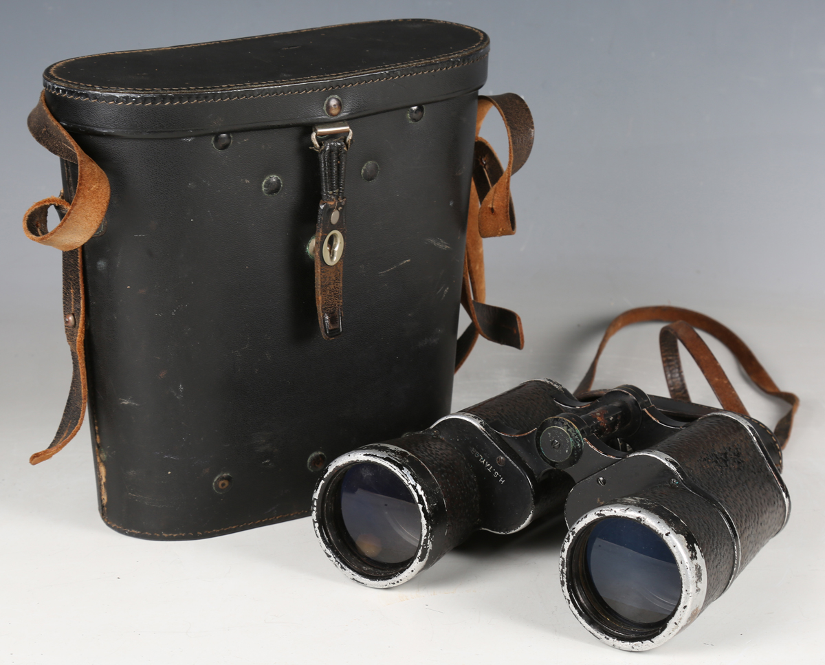 A pair of Second World War period German military issue 7x50 binoculars by Carl Zeiss Jena, numbered 'DE 1988910 Aril Nr 1875', with black painted finish and leather lens cap protector, with stitched leather fitted case (overall wear and tear and loss to paint finish throughout).