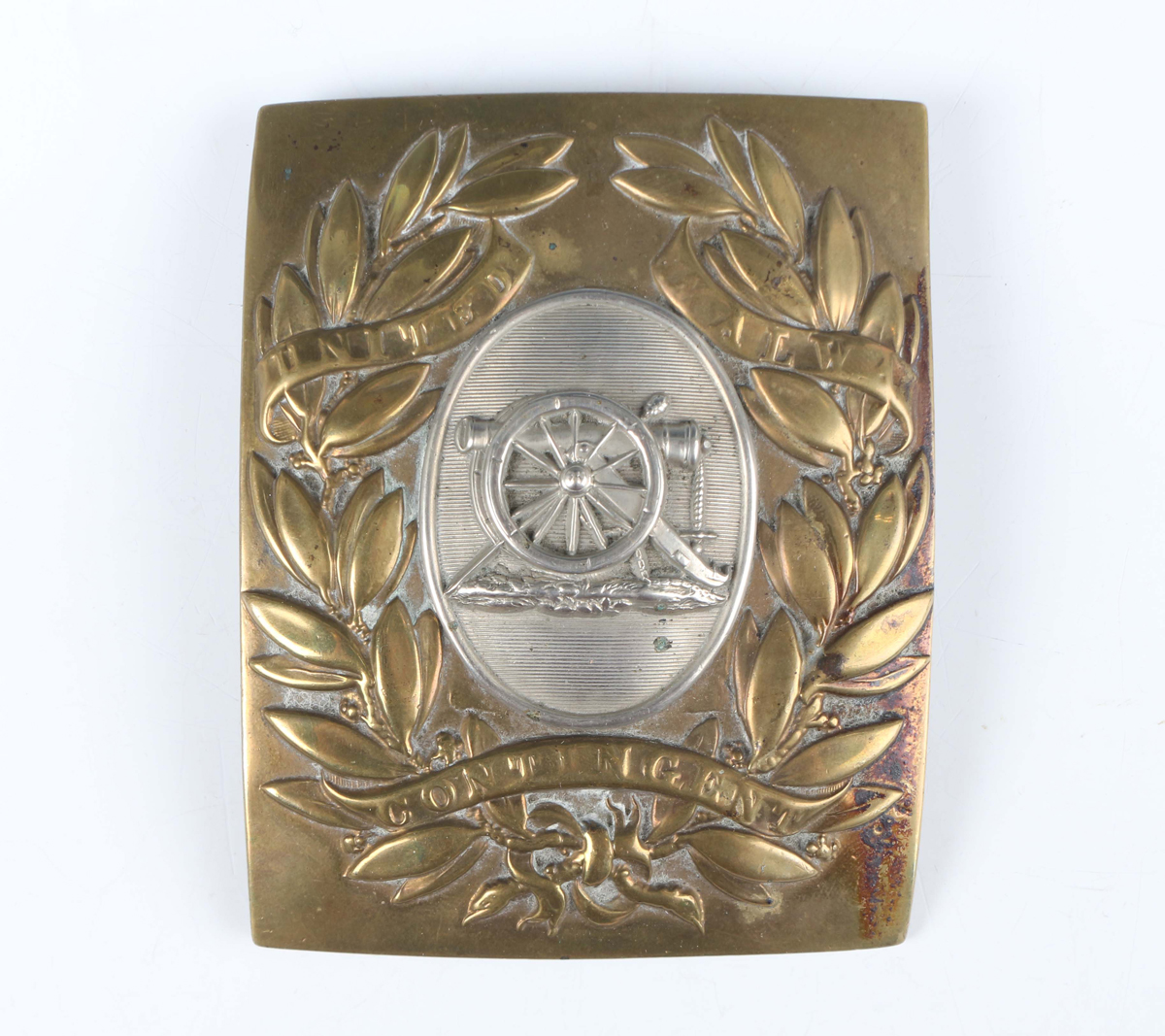 An Indian Army officer's brass and white metal shoulder belt plate, the centre with a field cannon within an oval surround, the foliate wreath form border detailed ‘United Malwa Contingent’, the back with four loop form attachments, circa 1850, with paper label, detailed ‘Uncle G H Robertson’s clasp’.