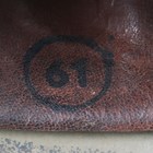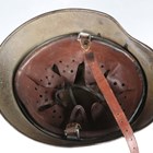 A German M35 combat helmet with black painted body, interior leather lining and associated leather chin strap, the interior body stamp '3025', the interior leather lining printed '61'.