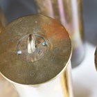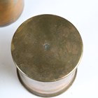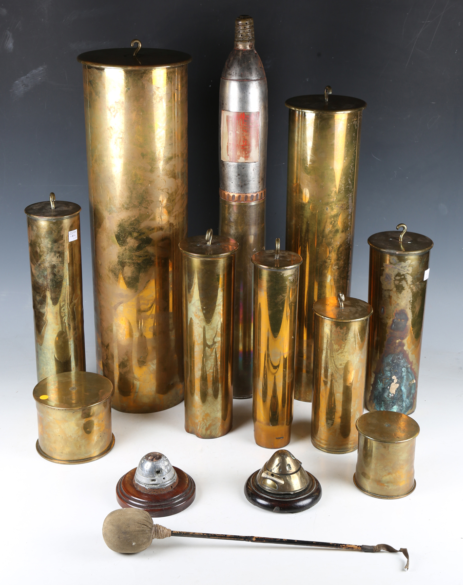 A collection of First World War period brass shell case gongs, the largest detailed 'Patronenfabrik Karlsruhe Mai 1916', height 57.5cm.
