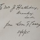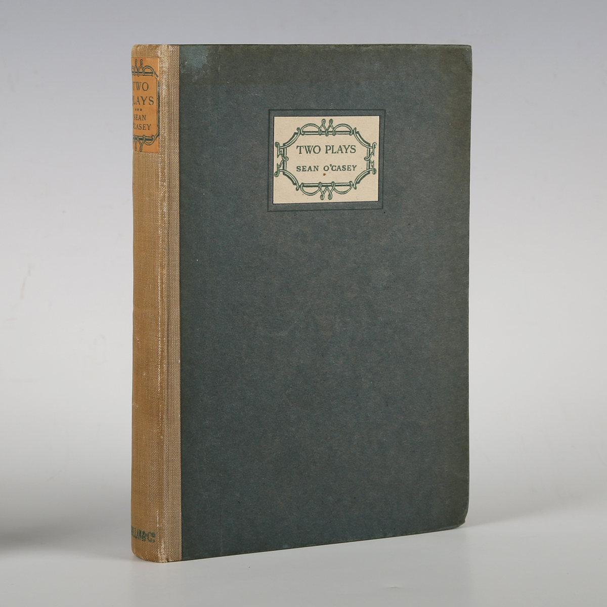 O’CASEY, Sean. Two Plays. London: Macmillan & Co., Limited, 1925. First edition, signed and inscribed by Sean O’Casey to the front-free endpaper, 8vo (189 x 124mm.) (Toning, occasional light spotting.) Original grey cloth-backed boards, mounted paper labels to spine and upper cover (minor mark to spine, small abrasion to upper cover). Note: the inscription reads: ‘To Mr. J. Halliday, Bramley Leeds, from Sean O’Casey. 24/11/25’. Note: contains two of O’Casey’s most significant plays: ‘Juno and the Paycock’ and ‘Shadow of a Gunman’. Provenance: R. Palmer (typed letter loosely inserted, dated 1925); J. Halliday (inscribed to from the author).