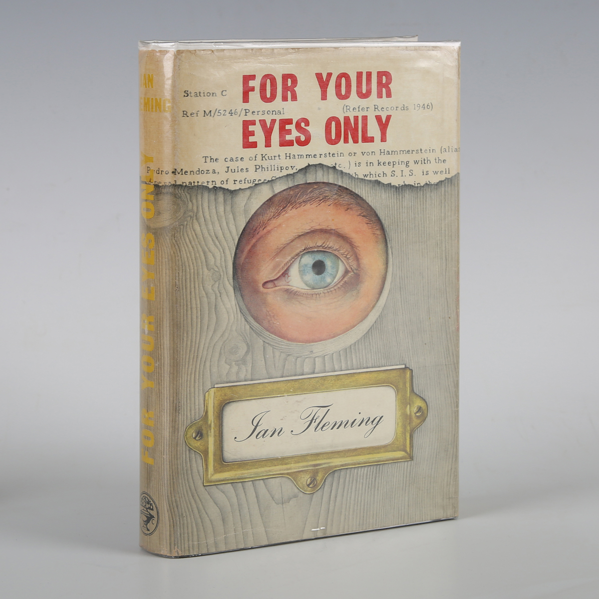 FLEMING, Ian. For Your Eyes Only. London: Jonathan Cape, 1960. First edition, first impression, 8vo (188 x 120mm.) (Toning, spotting to fore-edge, gift inscribed on front pastedown, dated 1961.) Original black cloth with white eye design to upper cover (lightly bumped spine ends), dust-jacket (sunning to spine panel, light creasing to extremities). Note: the dust-jacket with the price of 15s on the inner flap.