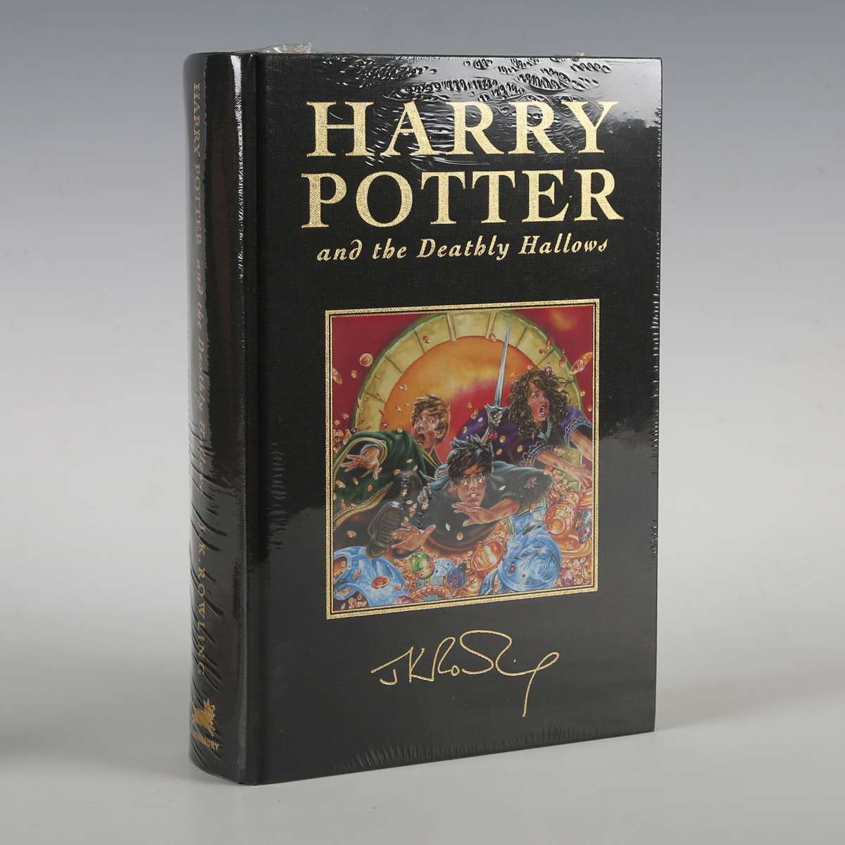 ROWLING, J.K. Harry Potter and the Deathly Hallows. London: Bloomsbury, 2007. Collector’s Deluxe First Edition, 8vo (239 x 148mm.) Original cloth with mounted illustration By Jason Cockcroft to upper cover, g.e. Note: still in publisher’s shrink-wrap with ‘First Edition’ sticker.