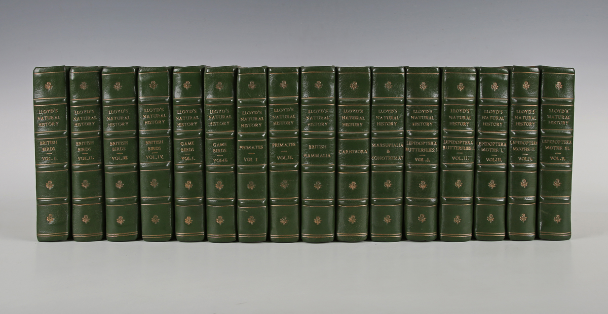 BOWDLER-SHARPE, R. (editor). Lloyd’s Natural History. London: Edward Lloyd, 1896-1897. 16 vols., 8vo (182 x 116mm.) Numerous chromolithographed plates. (Toning, occasional minor spotting, blanks replaced.) Late 20th century green half morocco over marbled paper-covered boards (endpapers replaced). Note: comprises Richard Lydekker’s ‘Mammals’, ‘Cats’, ‘Marsupials’; Ogilvie-Grant’s ‘British Birds’ (2 vols.); H.O. Forbe’s ‘Monkeys’ (2 vols.); Bowdler-Sharpe’s ‘British Birds’ (4 vols.); and W.F. Kirby’s ‘Butterflies and Moths’ (2 vols.) (16).
