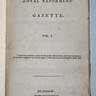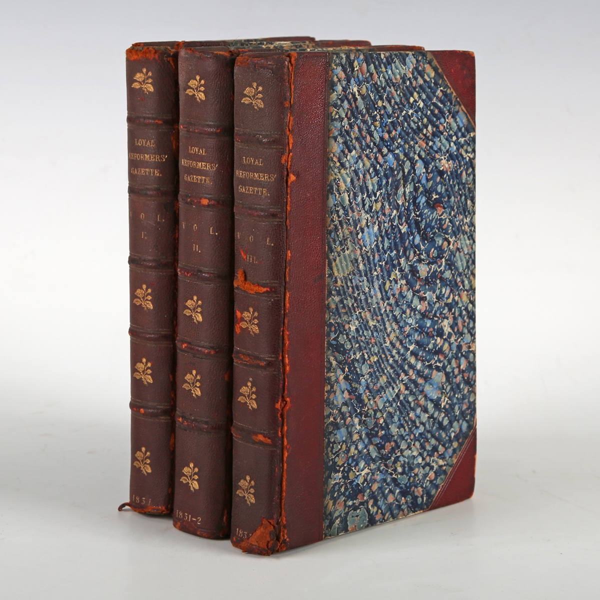SCOTTISH REFORM. The Loyal Reformers’ Gazette. Glasgow: Muir, Gowans, & Co., May 7th 1831- February 23rd 1833. 3 vols., no. 1-90, 8vo (187 x 113mm.) Wood-engraved headpieces, 4pp. and 3pp. ‘Index’. (Occasional dust-soiling, cuts or tears to several leaves in vol. 2.) Contemporary red half morocco (extremities rubbed, spines heavily, upper joint of vol. 3 splitting). Provenance: John Hopkins University (bookplates to front pastedowns and embossed stamps). Note: an unbroken run of this scarce weekly. After the Reform Act was passed in May 1832, it became known (from no. 55 onwards) as ‘The Reformers’ Gazette’. It played an important role in raising political awareness and suffrage amongst the working-class in Glasgow (3).