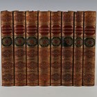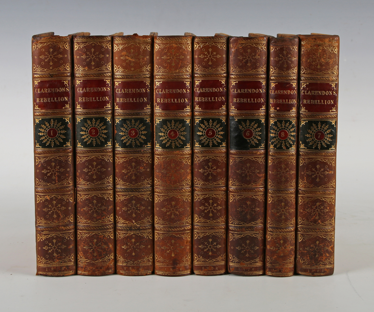 BINDING. – Edward Hyde CLARENDON. The History of the Rebellion and Civil Wars in England to which is Added an Historical View of the Affairs of Ireland. Oxford: at the Clarendon Press, 1826. 8 vols., new edition, 8vo (219 x 130mm.) Half-titles. (Moderate spotting to preliminaries and rear leaves.) Near contemporary tree calf, red and black morocco lettering pieces to the spines with red morocco onlay to the black, gilt (rebacked with original spines laid-down, excepting vol. 3, repair to black lettering piece of vol. 6) (8).