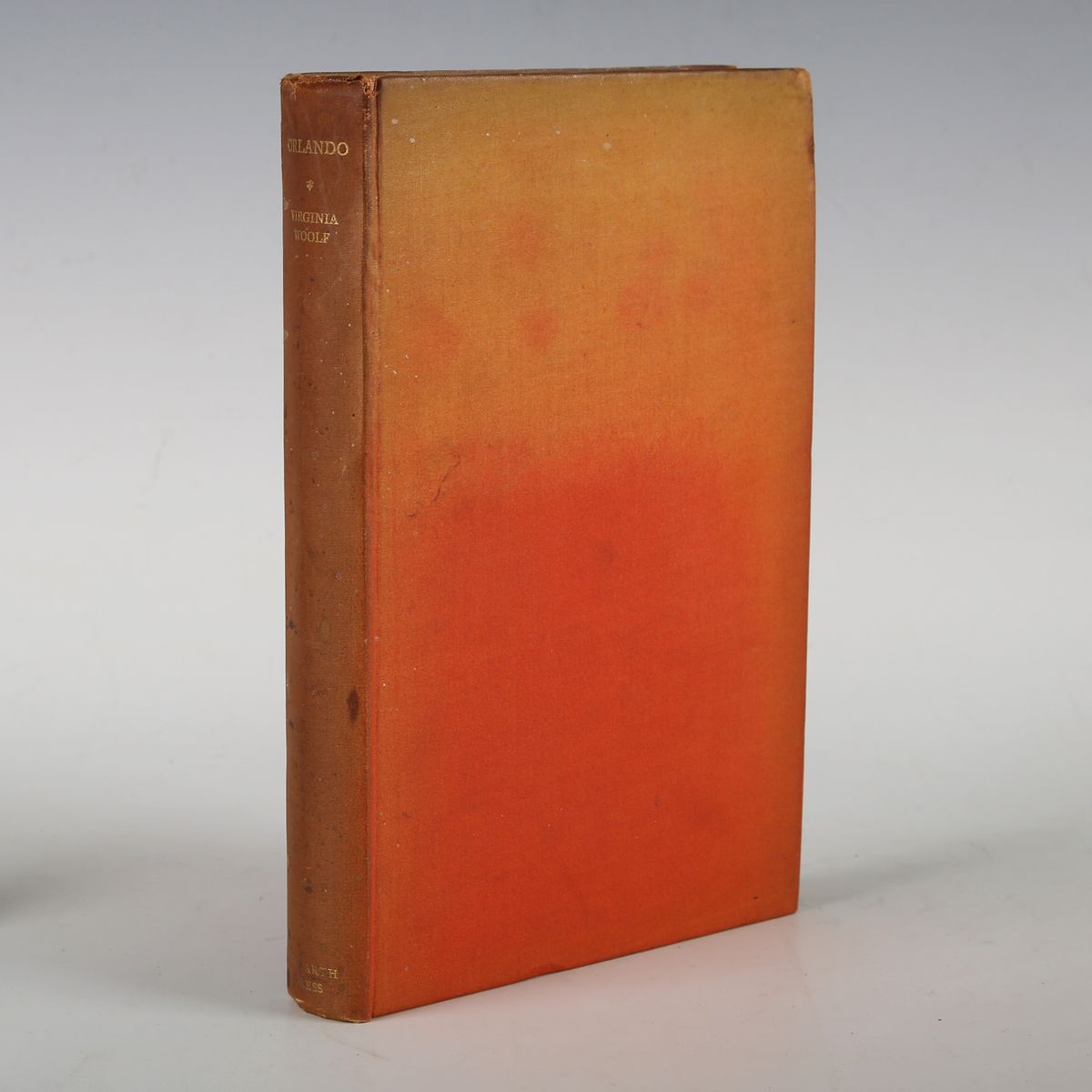 WOOLF, Virginia. Orlando, a Biography. London: Hogarth Press, 1928. First edition, second impression, 8vo (215 x 136mm.) A tipped-in newspaper obituary of Virginia Woolf on the initial blank, a mounted upper cover of the dust-jacket on the front-free endpaper. (Spotting to preliminaries, toning to margins.) Original orange cloth (discoloured, spine browned and stained). Provenance: C.R. and J.E. Ashbee (oval morocco bookplate to front pastedown).