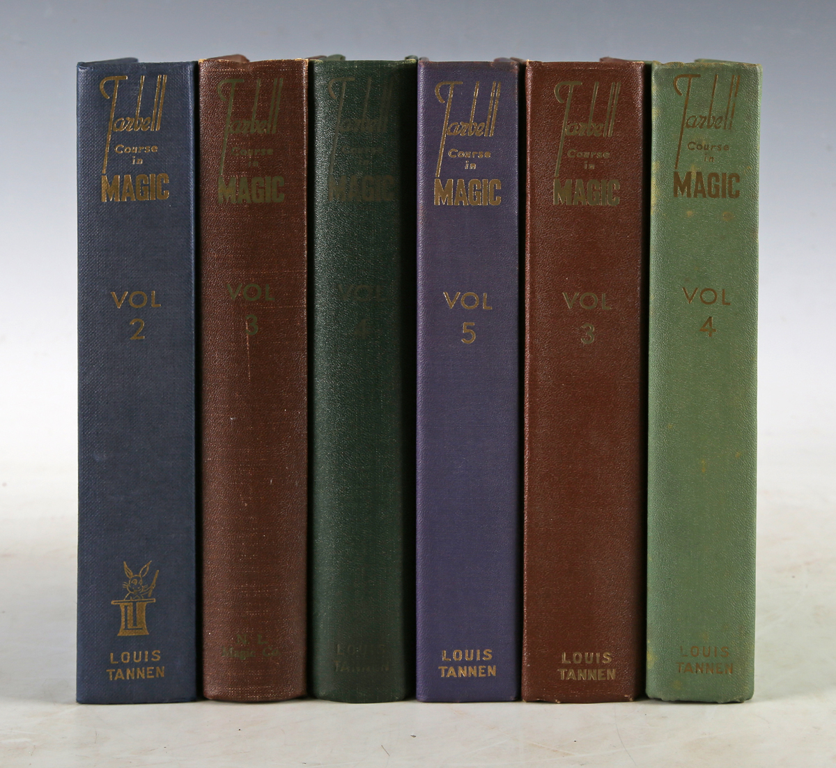 CONJURING. – Harlan TARBELL. The Tarbell Course in Magic. New York: Louis Tannen, 1943-1948. 4 vols. [of 8]. Mixed editions, 8vo (222 x 142mm.) Photographic frontispieces, illustrations. (Toning.) Original cloths (lightly bumped spine ends). Provenance: Adrian Harris (ownership stamps verso frontispieces of volumes 3 and 4); L. Davenport & Co. (stamp to front-free endpaper of volume 5). – And a further two volumes (being duplicate copies of volumes 3 and 4) (6).